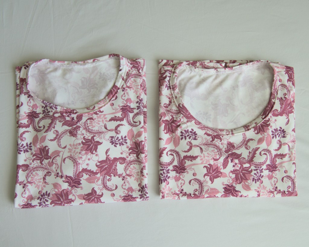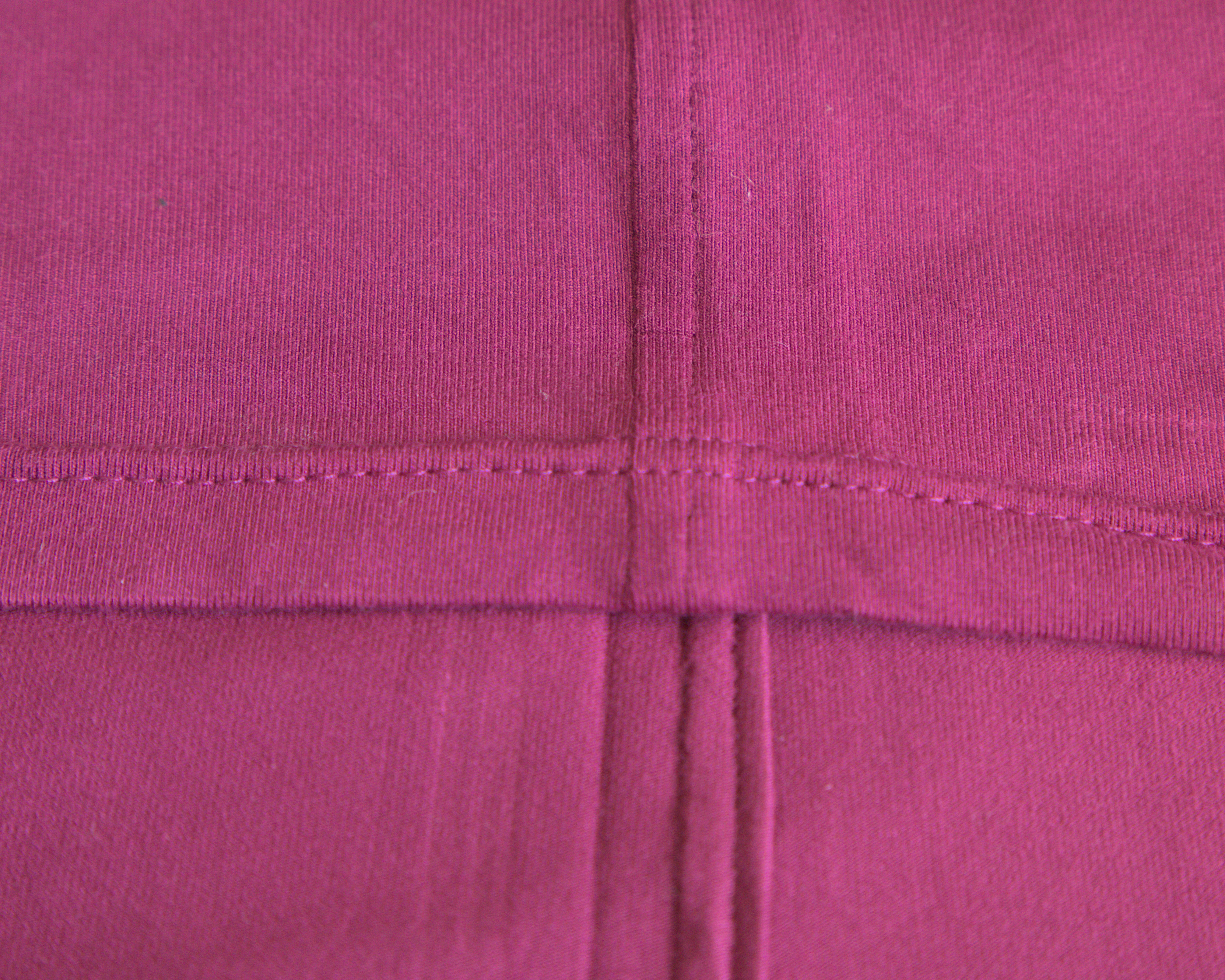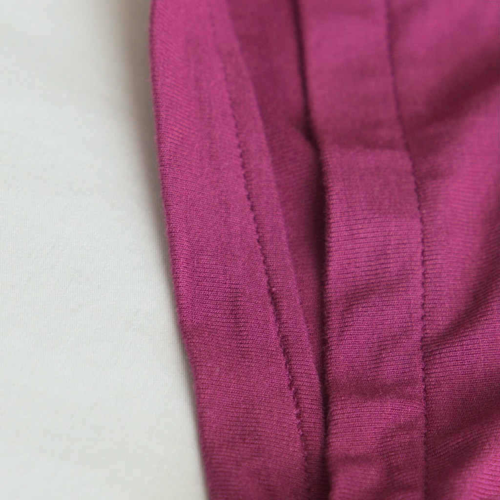 The bottom hem on our tops have double stitching on the front for a more professional look. This has more stitching on the inside but can easily be substituted with the same hemming as the sleeves if you like to tuck your tops in.